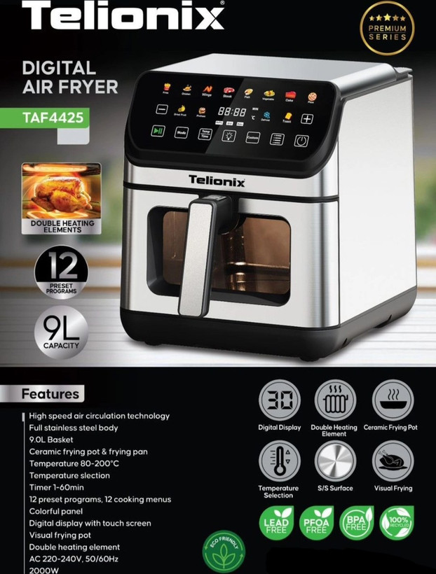 سرخ کن 9 لیتری تلیونیکس مدل 4425 دستگاهی قدرتمند و پیشرفته است که با بهرهگیری از المنت و فناوری گردش هوای گرم، غذاها را به طور کامل و یکنواخت مغزپخت میکند. این سرخ کن 9 لیتری، با داشتن 12 برنامه پخت از پیش تعیین شده، امکان تهیه انواع غذاها از جمله پیتزا، سیب زمینی سرخ کرده، مرغ سوخاری، کیک، میگو، مرغ، گوشت و ماهی را به راحتی فراهم میکند.