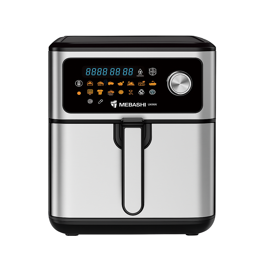 سرخ کن بدون روغن مباشی مدل ME-AF973 از توان مصرفی 1850 وات و گنجایش کل 7 لیتر بهرهمند است. این دستگاه به دلیل داشتن تنظیمات آسان، کیفیت خوب ساخت و قابلیت شستوشو و تمیز کردن آسان یکی از دستگاههای قابل انتخاب برای آشپزخانهی شما می باشد.جنس پوشش سبد این سرخ کن نچسب است. با گذاشتن مواد داخل دیگ دستگاه و روشن کردن آن جریان هوای داغ باعث می شود تا با سرعت مواد کامل پخته و سرخ می شود. برای پختن و سرخ کردن مواد در داخل این دستگاه با توجه به مقدار مواد نیاز به یک یا دو قاشق غذاخوری روغن دارید. سرخ کن به سرعت گرم می شود و جریان هوای داغ از همه طرف به مواد برخورد می کند. این ویژگی باعث می شود تا مواد از همه طرف به خوبی پخته و سرخ شود.به دلیل مصرف روغن بسیار کم در این مدل سرخ کن و هواپز مواد آماده شده از کیفیت و استانداردهای بهداشتی برخوردار است. غذاهای آماده شده با این مدل دستگاه سرخ کن برای سلامتی انسان نسبت به سرخ کن های سنتی بسیار بهتر می باشند. در سرخ کن های سنتی مواد در داخل روغن داغ غوطه ور می شود و پس از آماده شدن داخل مواد پر از روغن می باشد. این مورد برای سلامتی انسان مضر است و خوشبختانه در سرخ کن های بدون روغن و هواپز این مشکل برطرف شده است.