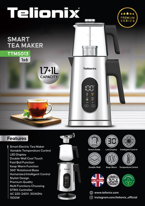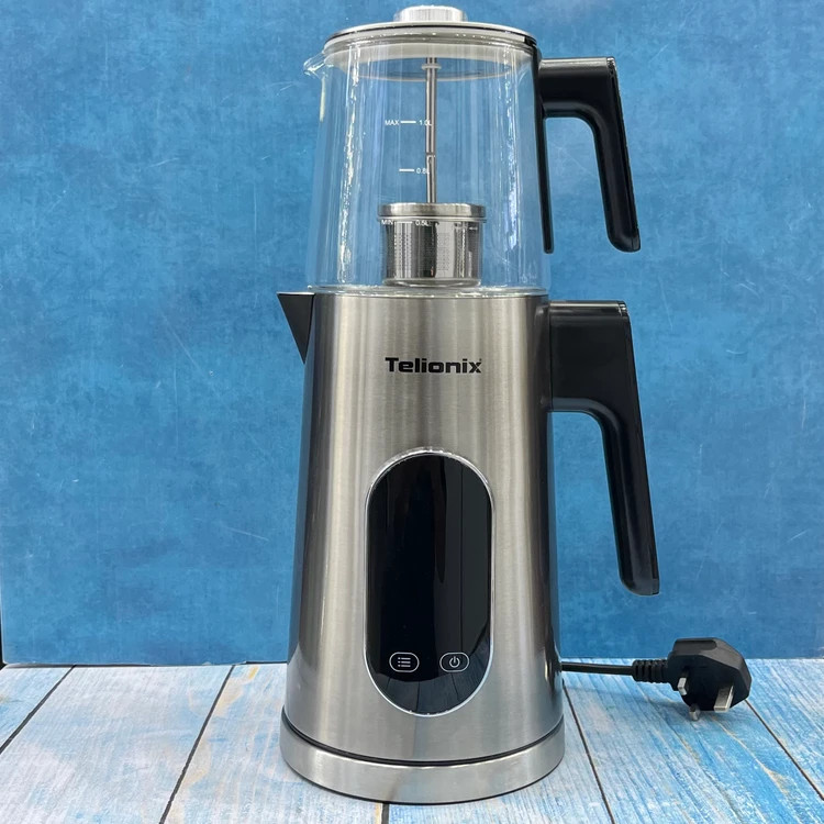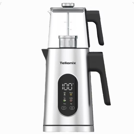چای ساز تلیونیکس مدل 5013 جدیدترین محصول شرکت تلیونیکس در دسته بندی نوشیدنی ساز ، چای ساز می باشد. ظرفیت کتری این چای ساز دارای گنجایش 1.7 لیتر می باشد. این کتری استیل ضد زنگ از نوع استیل 304 با قطر 0.5 میلی متر بوده که یکی از بهترین استیل های استفاده شده در کتری برقی می باشد. قوری این دستگاه نیز از جنس شیشه ای با ظرفیت 1 لیتر به همراه یک فیلتر تفاله گیر از جنس استیل ضد زنگ می باشد. توان مصرفی چای ساز گوسونیک 1500 وات می باشد. این توان مصرفی می تواند به سرعت آب را بجوش آورد. کنترل پنل چای ساز از نوع دیجیتالی لمسی بوده که می توانید دمای مورد نظر خود را برای تهیه انواع نوشیدنی مانند قهوه ، چای ، دم نوش تنظیم کنید. سیستم های ایمنی و نظارتی این چای ساز شامل ، سیستم قطع کن خودکار ، سیستم گرم نگهدارنده برای دم کشیدن چای ، سیستم قطع کن در صورت کتری خشک و سیستم محافظتی در صورت افزایش بیش از حد دما می باشد..