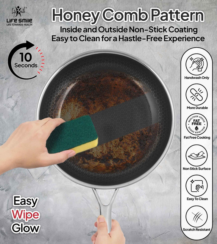 سالها پیش زمانی که ظروف تفلون وارد بازار شدند جای ظروف روحی را گرفتند اما این پایان ماجرا نبود و با ظهور ظروف گرانیتی، تفلون هم به تاریخ تکنولوژی پیوست. اما چه کسی فکرش را میکرد که امروز ظروف استیل کف لیزری تبدیل به کابوسی برای ظروف گرانیتی شوند. تکنولوژی روز دنیا در سرویس قابلمه استیل کف لیزری لایف اسمایل. ورق استیل سه لایه این محصول باعث تقسیم یکنواخت حرارت در سطح قابلمه میشود. قسمت داخل ظروف با تکنولوژی لیزر حکاکی شده و با پوشش نچسب پیشرفته پوشانده شده است. این پوشش فاقد هرگونه مواد سمی مانند PFOA بوده و در حرارت بالا تاثیر منفی بر روی مواد غذایی نمیگذارد. این پوشش در برابر خط و خش بسیار مقاوم است و شما دیگر نیازی به استفاده از کفگیر و ملاقههای نسوز ندارید، با خیال راحت از ابزار آشپزی استیل استفاده کنید تا سلامتی خود و خانواده خود را تضمین نمایید. ظروف پخت و پز لایف اسمایل قابل استفاده بر روی اجاق های القایی نیز میباشند. طول عمر این قابلمهها بسیار زیاد است و شما در طول زندگی خود دیگر نیازی به خرید قابلمههای جدید پیدا نمی کنید مگر آنکه از ظاهر سرویس قابلمه خود خسته شوید