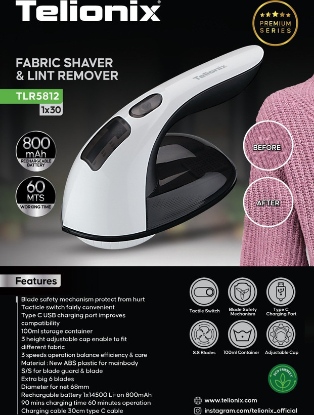 کمپانی تلیونیکس برای این دستگاه یک عدد درپوش تعبیه گردیده. که وجود این درپوش در دستگاه باعث میشود تا فاصله ای بین تیغه و لباس ایجاد شود. و این ویژگی می تواند پارچه های ظریف تر را با اطمینان بیشتری پرز گیری کند. به علاوه تیغه این محصول از جنس استیل ضد زنگ ساخته شده و سه پره هستند. کارایی پرز گیر لباس تلیونیکس TLR5812 Telionix بسیار راحت و آسان بـوده و هر کسی میتواند به راحتی از آن استفاده کند. برای این کار تنها کافیست که دستگاه را روشن و بر روی سطح پارچه حرکت دهید. تا دانه های پرز به سرعت توسط تیغه دستگاه جدا شوند. محصولی با عملکرد بسیار عالی و کیفیت ساخت بالا برای کار گسترده